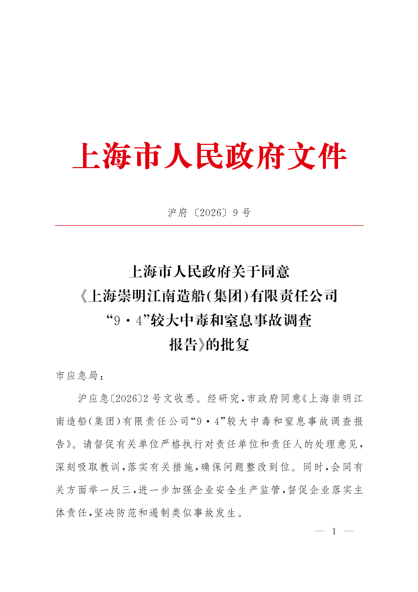 ??滬應(yīng)急〔2026〕2號文收悉。經(jīng)研究,市政府同意《上海崇明江南造船(集團(tuán))有限責(zé)任公司“9·4”較大中毒和窒息事故調(diào)查報(bào)告》。請督促有關(guān)單位嚴(yán)格執(zhí)行對責(zé)任單位和責(zé)任人的處理意見,深刻吸取教訓(xùn),落實(shí)有關(guān)措施,確保問題整改到位。同時,會同有關(guān)方面舉一反三,進(jìn)一步加強(qiáng)企業(yè)安全生產(chǎn)監(jiān)管,督促企業(yè)落實(shí)主體責(zé)任,堅(jiān)決防范和遏制類似事故發(fā)生。
