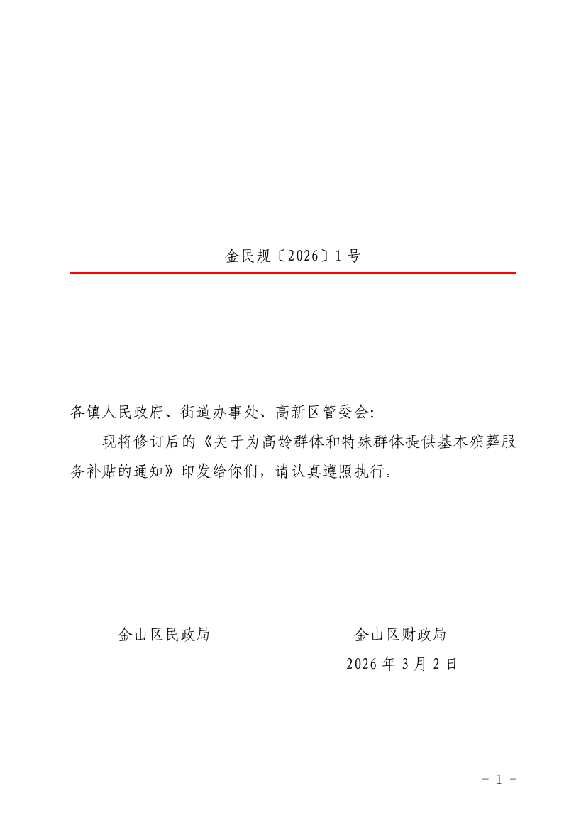 ??為貫徹落實(shí)民政部《關(guān)于全面推行惠民殯葬政策的指導(dǎo)意見》(民發(fā)〔2012〕211號(hào))、《上海市民政局、上海市財(cái)政局關(guān)于完善本市惠民殯葬政策的通知》(滬民規(guī)〔2025〕15號(hào))、《金山區(qū)人民政府辦公室關(guān)于印發(fā)<金山區(qū)區(qū)與鎮(zhèn)財(cái)權(quán)事權(quán)和支出責(zé)任劃分實(shí)施方案>的通知》(金府辦發(fā)〔2024〕13號(hào))精神,切實(shí)保障本區(qū)高齡群體和特殊群體基本殯葬服務(wù)需求,減輕群眾治喪負(fù)擔(dān),結(jié)合我區(qū)實(shí)際,重新修訂了《關(guān)于為高齡群體和特殊群體提供基本殯葬服務(wù)補(bǔ)貼的通知》,現(xiàn)將有關(guān)事項(xiàng)通知如下:
