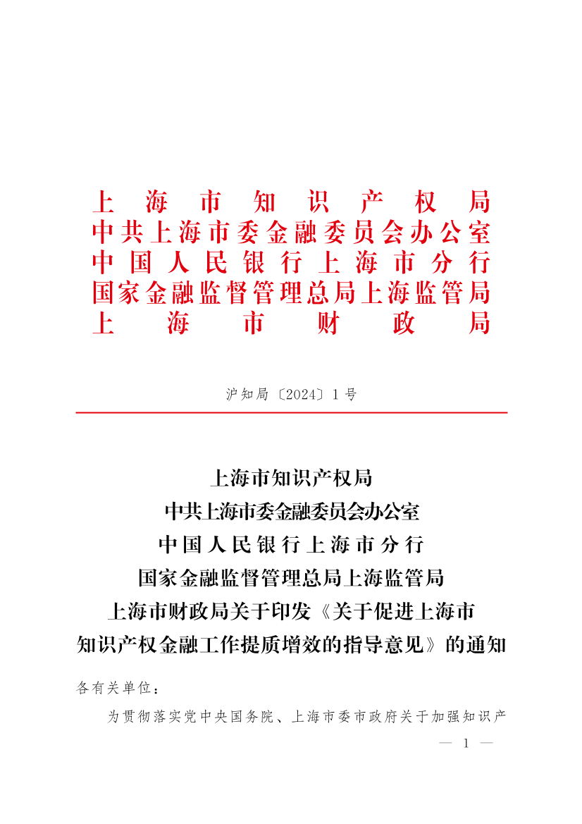 ??為貫徹落實(shí)黨中央國(guó)務(wù)院、上海市委市政府關(guān)于加強(qiáng)知識(shí)產(chǎn)權(quán)金融工作的決策部署和工作要求,上海市知識(shí)產(chǎn)權(quán)局、中共上海市委金融委員會(huì)辦公室、中國(guó)人民銀行上海市分行、國(guó)家金融監(jiān)督管理總局上海監(jiān)管局、上海市財(cái)政局聯(lián)合制定了《關(guān)于促進(jìn)上海市知識(shí)產(chǎn)權(quán)金融工作提質(zhì)增效的指導(dǎo)意見(jiàn)》,現(xiàn)予印發(fā),請(qǐng)遵照落實(shí)。