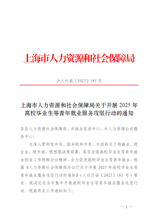 ??為深入貫徹黨中央、國(guó)務(wù)院和市委、市政府關(guān)于穩(wěn)就業(yè)、穩(wěn)企業(yè)、穩(wěn)市場(chǎng)、穩(wěn)預(yù)期決策部署,落實(shí)全國(guó)高校畢業(yè)生等青年就業(yè)創(chuàng)業(yè)工作視頻會(huì)議精神,全力促進(jìn)高校畢業(yè)生等青年就業(yè),根據(jù)《人力資源社會(huì)保障部辦公廳關(guān)于開(kāi)展2025年高校畢業(yè)生等青年就業(yè)服務(wù)攻堅(jiān)行動(dòng)的通知》(人社廳函〔2025〕103號(hào))要求,現(xiàn)決定在全市集中開(kāi)展高校畢業(yè)生等青年就業(yè)服務(wù)攻堅(jiān)行動(dòng)?,F(xiàn)就有關(guān)工作通知如下:
