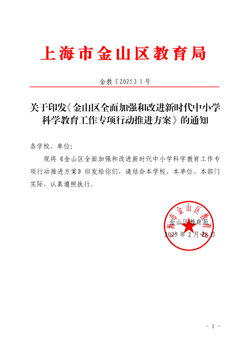 ??現(xiàn)將《金山區(qū)全面加強和改進新時代中小學科學教育工作專項行動推進方案》印發(fā)給你們,請結合本學校、本單位、本部門實際,認真遵照執(zhí)行。