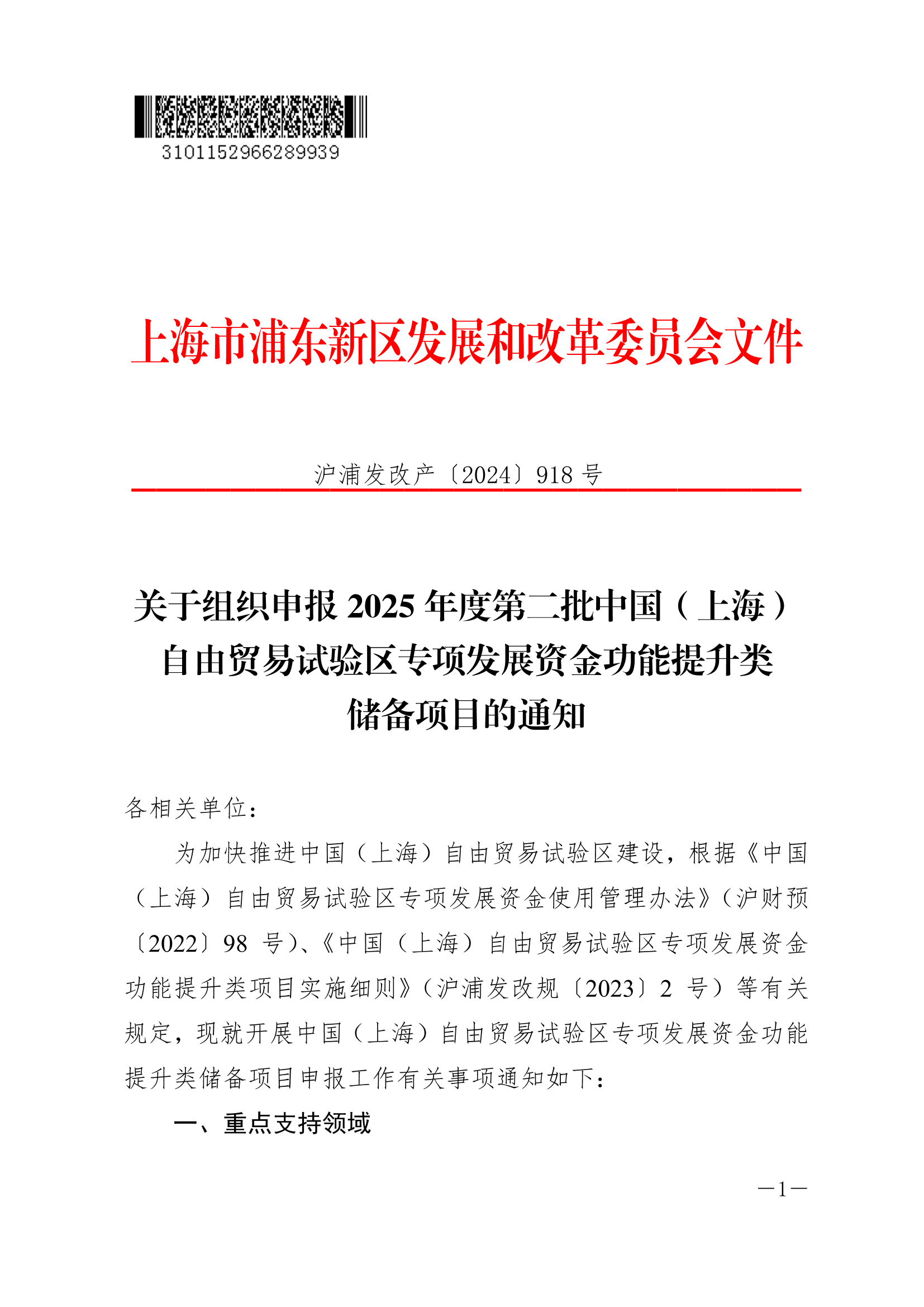 ??為加快推進中國(上海)自由貿(mào)易試驗區(qū)建設(shè),根據(jù)《中國(上海)自由貿(mào)易試驗區(qū)專項發(fā)展資金使用管理辦法》(滬財預(yù)〔2022〕98號)、《中國(上海)自由貿(mào)易試驗區(qū)專項發(fā)展資金功能提升類項目實施細則》(滬浦發(fā)改規(guī)〔2023〕2號)等有關(guān)規(guī)定,現(xiàn)就開展中國(上海)自由貿(mào)易試驗區(qū)專項發(fā)展資金功能提升類儲備項目申報工作有關(guān)事項通知如下: