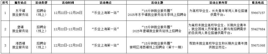 ??“15分鐘就業(yè)服務(wù)圈”社區(qū)就業(yè)服務(wù)站點(diǎn)建設(shè)市政府實(shí)事項(xiàng)目作為人社部門(mén)常態(tài)化政府開(kāi)放活動(dòng)之一,我們將持續(xù)發(fā)布精彩服務(wù)內(nèi)容,今天為大家?guī)?lái)黃浦區(qū)、長(zhǎng)寧區(qū)、松江區(qū)、青浦區(qū)、崇明區(qū)、楊浦區(qū)、閔行區(qū)近期就業(yè)活動(dòng)安排!