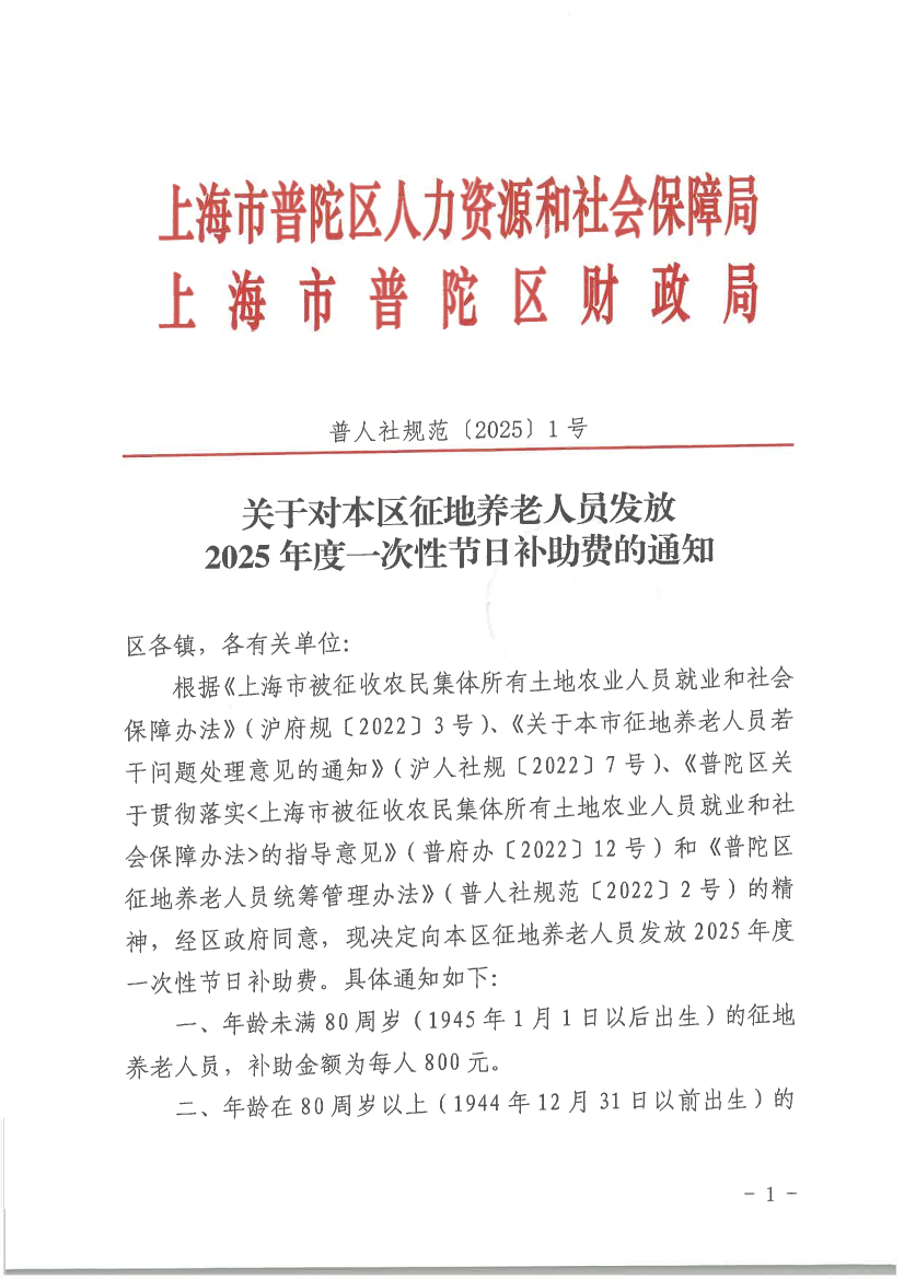 ??根據(jù)《上海市被征收農(nóng)民集體所有土地農(nóng)業(yè)人員就業(yè)和社會(huì)保障辦法》(滬府規(guī)〔2022〕3號(hào))、《關(guān)于本市征地養(yǎng)老人員若干問題處理意見的通知》(滬人社規(guī)〔2022〕7號(hào))、《普陀區(qū)關(guān)于貫徹落實(shí)<上海市被征收農(nóng)民集體所有土地農(nóng)業(yè)人員就業(yè)和社會(huì)保障辦法>的指導(dǎo)意見》(普府辦〔2022〕12號(hào))和《普陀區(qū)征地養(yǎng)老人員統(tǒng)籌管理辦法》(普人社規(guī)范〔2022〕2號(hào))的精神,經(jīng)區(qū)政府同意,現(xiàn)決定向本區(qū)征地養(yǎng)老人員發(fā)放2025年度一次性節(jié)日補(bǔ)助費(fèi)。具體通知如下: