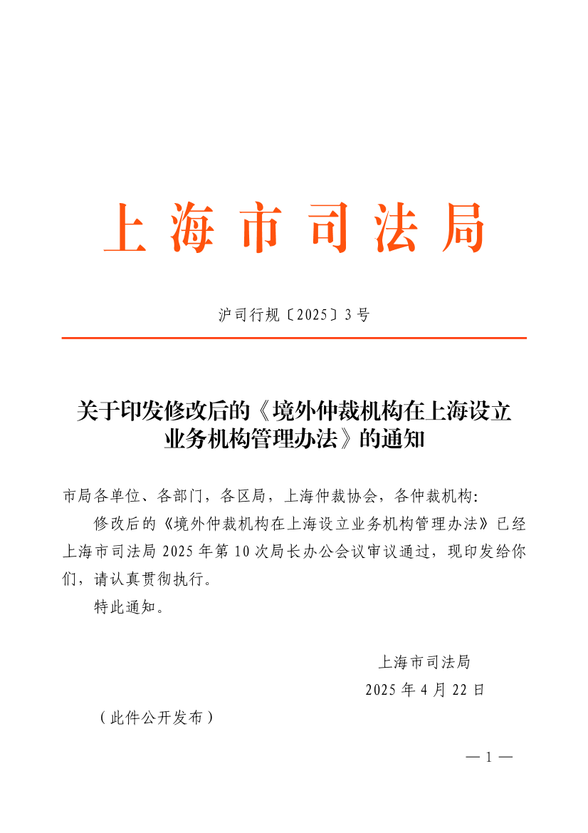 ??修改后的《境外仲裁機(jī)構(gòu)在上海設(shè)立業(yè)務(wù)機(jī)構(gòu)管理辦法》已經(jīng)上海市司法局2025年第10次局長(zhǎng)辦公會(huì)議審議通過(guò),現(xiàn)印發(fā)給你們,請(qǐng)認(rèn)真貫徹執(zhí)行。