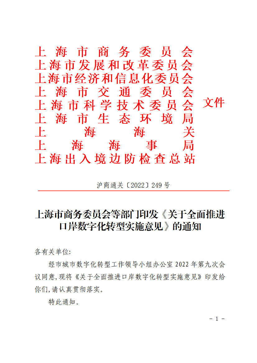 ??為全面推進本市智慧口岸建設,根據(jù)市委、市政府《關于全面推進上海城市數(shù)字化轉(zhuǎn)型的意見》(滬委發(fā)〔2020〕35號)《推進上海經(jīng)濟數(shù)字化轉(zhuǎn)型 賦能高質(zhì)量發(fā)展行動方案(2021-2023年)》(滬數(shù)字化辦〔2021〕1號)和《全面推進上海數(shù)字商務高質(zhì)量發(fā)展實施意見》(滬商電商〔2021〕121號)等要求,特制定本實施意見。