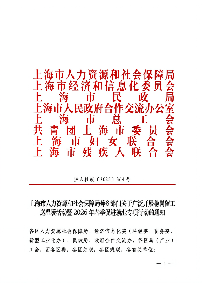 ??為深入學(xué)習(xí)貫徹習(xí)近平總書記考察上海重要講話精神,全面貫徹黨的二十屆四中全會(huì)和十二屆市委歷次全會(huì)精神,貫徹落實(shí)黨中央、國(guó)務(wù)院和市委、市政府關(guān)于穩(wěn)就業(yè)工作的決策部署,堅(jiān)持以人民為中心的發(fā)展思想,深入踐行人民城市理念,積極做好元旦春節(jié)前后勞動(dòng)者穩(wěn)崗留工和返崗促就業(yè)以及企業(yè)用工保障工作,全力穩(wěn)就業(yè)、保用工、優(yōu)服務(wù)、促發(fā)展,根據(jù)人力資源社會(huì)保障部等部門關(guān)于開展2026年“春風(fēng)行動(dòng)”“就業(yè)援助月”“春暖農(nóng)民工”等活動(dòng)要求,市人力資源社會(huì)保障局、市經(jīng)濟(jì)信息化委、市民政局、市政府合作交流辦、市總工會(huì)、團(tuán)市委、市婦聯(lián)、市殘聯(lián)決定開展穩(wěn)崗留工送溫暖活動(dòng)暨2026年春季促進(jìn)就業(yè)專項(xiàng)行動(dòng)?,F(xiàn)將有關(guān)事項(xiàng)通知如下: