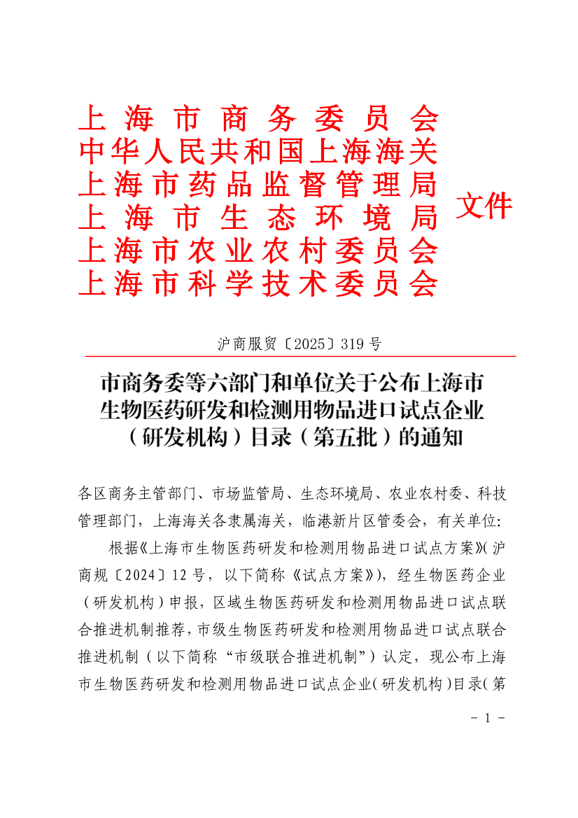 ??根據(jù)《上海市生物醫(yī)藥研發(fā)和檢測用物品進口試點方案》(滬商規(guī)〔2024〕12號,以下簡稱《試點方案》),經(jīng)生物醫(yī)藥企業(yè)(研發(fā)機構(gòu))申報,區(qū)域生物醫(yī)藥研發(fā)和檢測用物品進口試點聯(lián)合推進機制推薦,市級生物醫(yī)藥研發(fā)和檢測用物品進口試點聯(lián)合推進機制(以下簡稱“市級聯(lián)合推進機制”)認定,現(xiàn)公布上海市生物醫(yī)藥研發(fā)和檢測用物品進口試點企業(yè)(研發(fā)機構(gòu))目錄(第五批)。