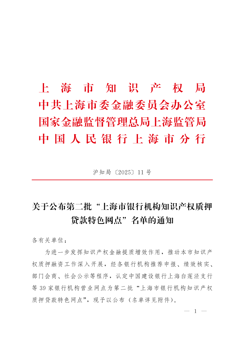 ??為進(jìn)一步發(fā)揮知識產(chǎn)權(quán)金融提質(zhì)增效作用,推動本市知識產(chǎn)權(quán)質(zhì)押融資工作深入開展,經(jīng)各銀行機構(gòu)推薦申報、績效核實、部門會商、社會公示等程序,認(rèn)定中國建設(shè)銀行上海白蓮涇支行等39家銀行機構(gòu)營業(yè)網(wǎng)點為第二批“上海市銀行機構(gòu)知識產(chǎn)權(quán)質(zhì)押貸款特色網(wǎng)點”,現(xiàn)予以公布(名單詳見附件)。