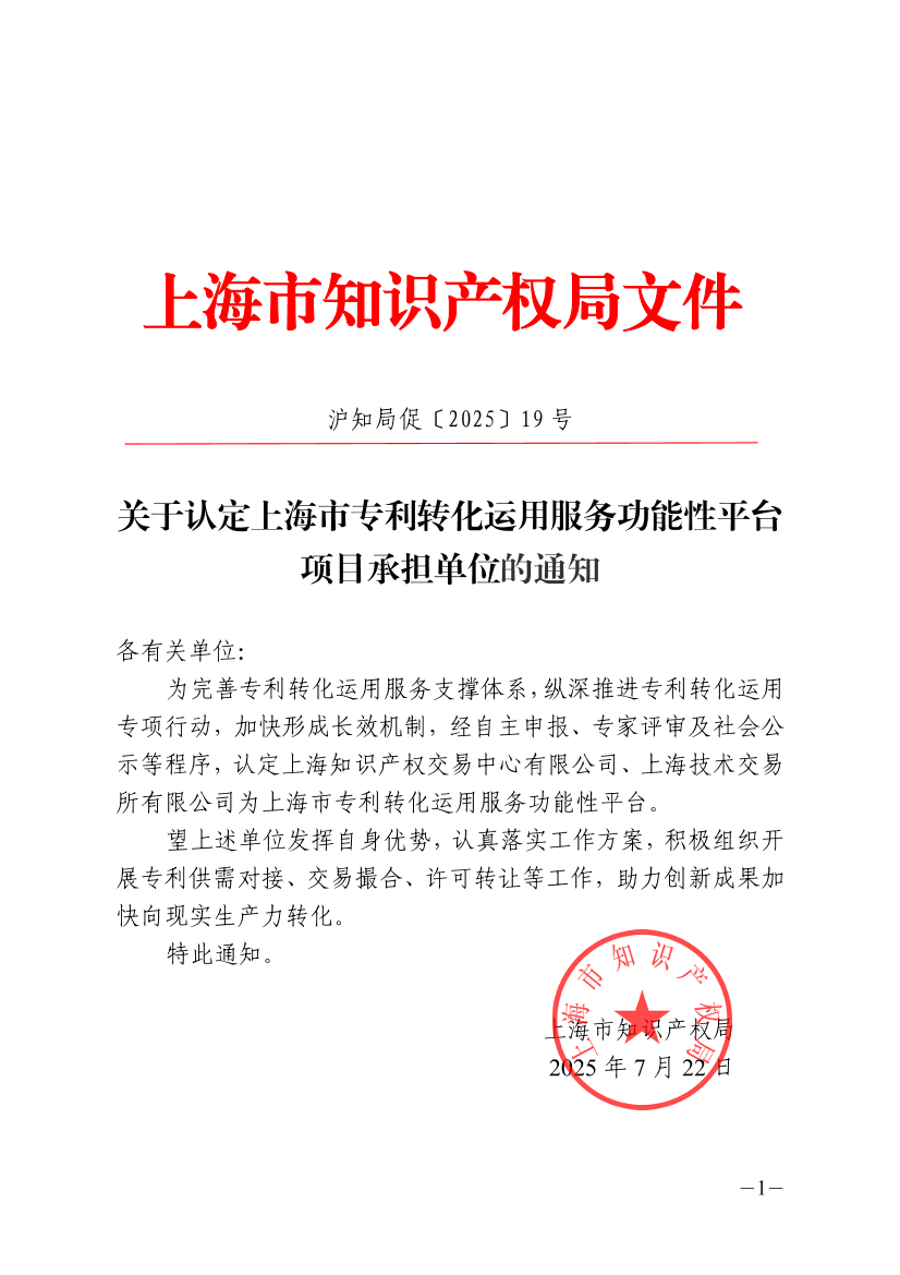 ??為完善專利轉(zhuǎn)化運(yùn)用服務(wù)支撐體系,縱深推進(jìn)專利轉(zhuǎn)化運(yùn)用專項(xiàng)行動(dòng),加快形成長(zhǎng)效機(jī)制,經(jīng)自主申報(bào)、專家評(píng)審及社會(huì)公示等程序,認(rèn)定上海知識(shí)產(chǎn)權(quán)交易中心有限公司、上海技術(shù)交易所有限公司為上海市專利轉(zhuǎn)化運(yùn)用服務(wù)功能性平臺(tái)。
