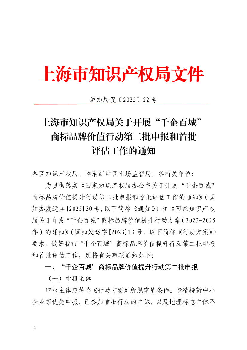 ??為貫徹落實(shí)《國(guó)家知識(shí)產(chǎn)權(quán)局辦公室關(guān)于開展“千企百城”商標(biāo)品牌價(jià)值提升行動(dòng)第二批申報(bào)和首批評(píng)估工作的通知》(國(guó)知辦發(fā)運(yùn)字[2025]30號(hào),以下簡(jiǎn)稱《通知》)和《國(guó)家知識(shí)產(chǎn)權(quán)局關(guān)于印發(fā)“千企百城”商標(biāo)品牌價(jià)值提升行動(dòng)方案(2023-2025年)的通知》(國(guó)知發(fā)運(yùn)字[2023]13號(hào),以下簡(jiǎn)稱《行動(dòng)方案》)要求,做好我市“千企百城”商標(biāo)品牌價(jià)值提升行動(dòng)第二批申報(bào)和首批評(píng)估工作,現(xiàn)將有關(guān)事項(xiàng)通知如下: