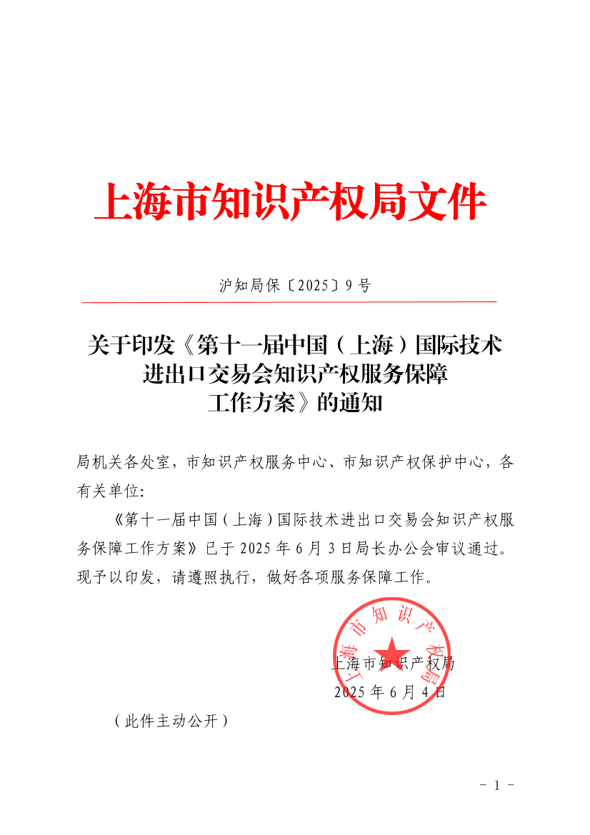 ??《第十一屆中國(上海)國際技術(shù)進(jìn)出口交易會(huì)知識(shí)產(chǎn)權(quán)服務(wù)保障工作方案》已于2025年6月3日局長辦公會(huì)審議通過?,F(xiàn)予以印發(fā),請遵照執(zhí)行,做好各項(xiàng)服務(wù)保障工作。