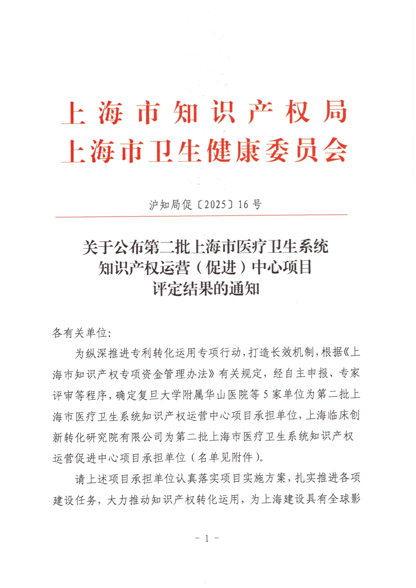 ??為縱深推進專利轉(zhuǎn)化運用專項行動,打造長效機制,根據(jù)《上海市知識產(chǎn)權(quán)專項資金管理辦法》有關(guān)規(guī)定,經(jīng)自主申報、專家評審等程序,確定復(fù)旦大學(xué)附屬華山醫(yī)院等5家單位為第二批上海市醫(yī)療衛(wèi)生系統(tǒng)知識產(chǎn)權(quán)運營中心項目承擔(dān)單位,上海臨床創(chuàng)新轉(zhuǎn)化研究院有限公司為第二批上海市醫(yī)療衛(wèi)生系統(tǒng)知識產(chǎn)權(quán)運營促進中心項目承擔(dān)單位(名單見附件)。