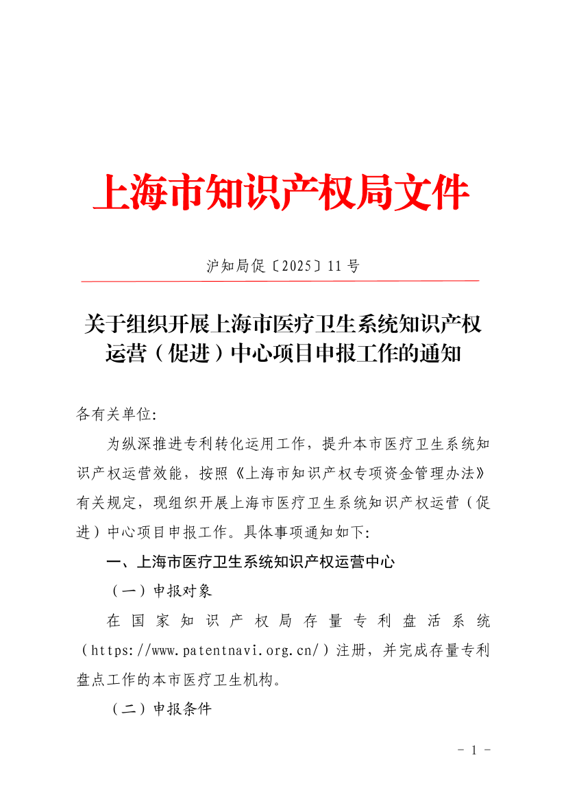 ??為縱深推進(jìn)專利轉(zhuǎn)化運(yùn)用工作,提升本市醫(yī)療衛(wèi)生系統(tǒng)知識(shí)產(chǎn)權(quán)運(yùn)營效能,按照《上海市知識(shí)產(chǎn)權(quán)專項(xiàng)資金管理辦法》有關(guān)規(guī)定,現(xiàn)組織開展上海市醫(yī)療衛(wèi)生系統(tǒng)知識(shí)產(chǎn)權(quán)運(yùn)營(促進(jìn))中心項(xiàng)目申報(bào)工作。具體事項(xiàng)通知如下: