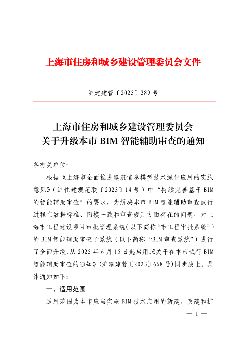 ??根據(jù)《上海市全面推進(jìn)建筑信息模型技術(shù)深化應(yīng)用的實(shí)施意見》(滬住建規(guī)范聯(lián)〔2023〕14號(hào))中“持續(xù)完善基于BIM的智能輔助審查”的要求,為解決本市BIM智能輔助審查試行過程在數(shù)據(jù)標(biāo)準(zhǔn)、圖模一致和審查規(guī)則方面存在的問題,對(duì)上海市工程建設(shè)項(xiàng)目審批管理系統(tǒng)(以下簡(jiǎn)稱“市工程審批系統(tǒng)”)的BIM智能輔助審查子系統(tǒng)(以下簡(jiǎn)稱“BIM審查系統(tǒng)”)進(jìn)行了全面升級(jí),從2025年6月15日起啟用?!蛾P(guān)于在本市試行BIM智能輔助審查的通知》(滬建建管〔2023〕668號(hào))同步廢止。具體通知如下: