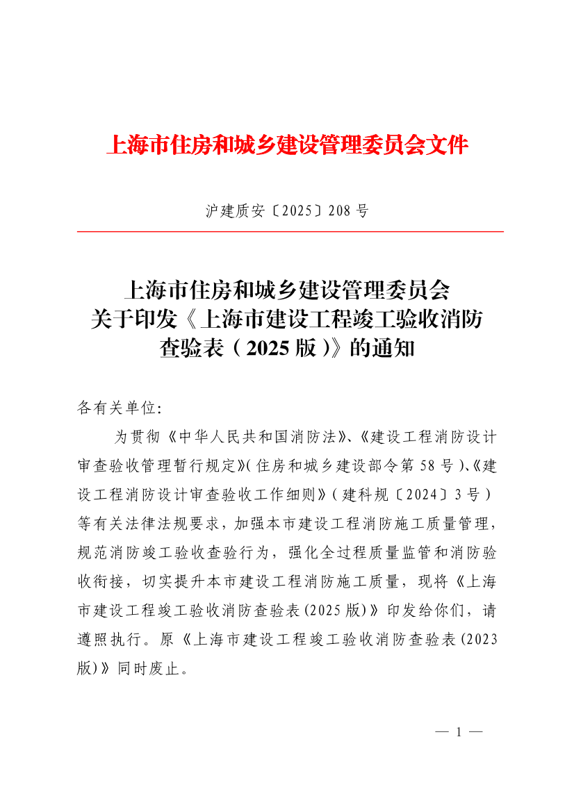 上海市住房和城鄉(xiāng)建設(shè)管理委員會關(guān)于印發(fā)《上海市建設(shè)工程竣工驗收消防查驗表(2025版)》的通知