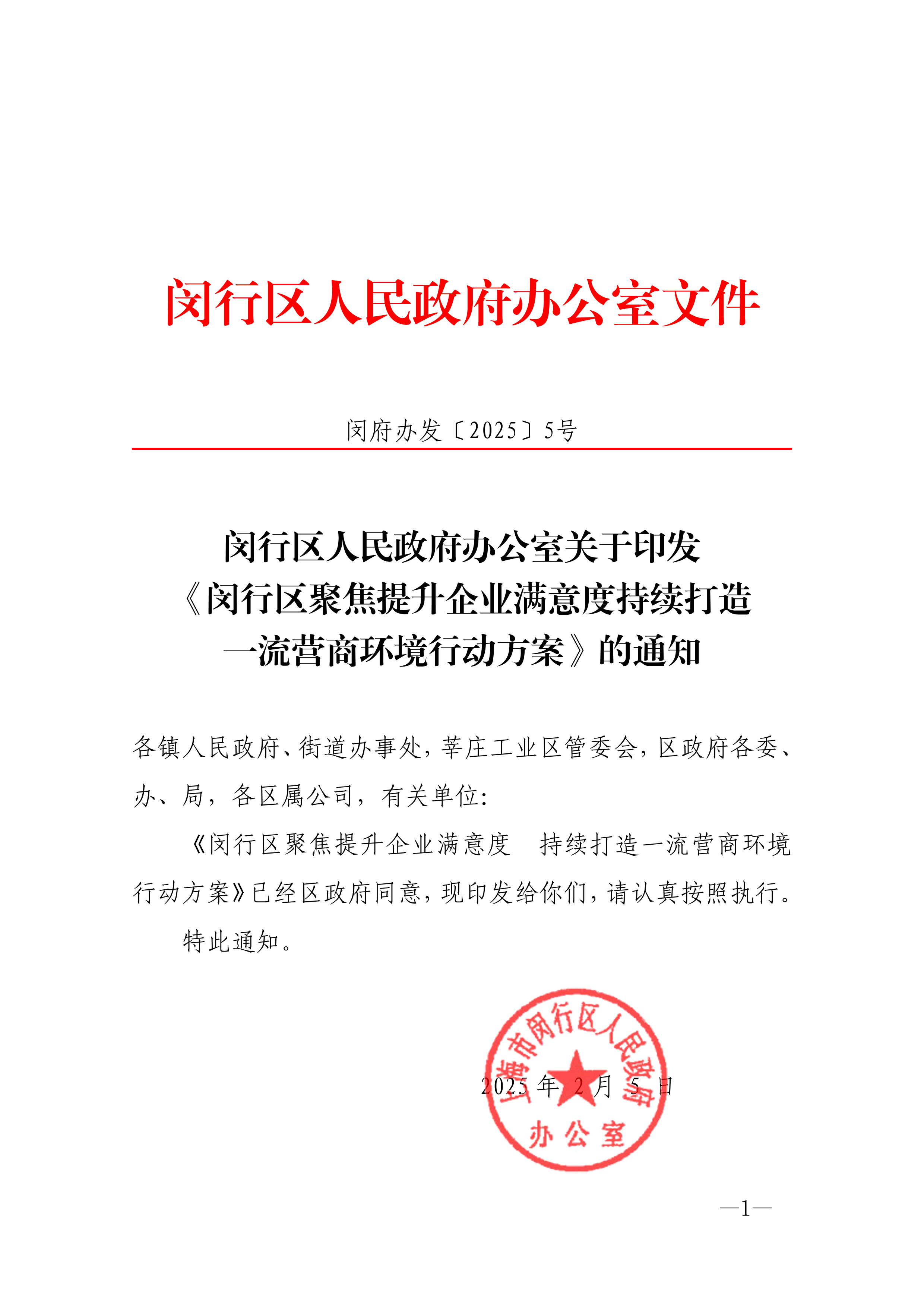 閔行區(qū)人民政府辦公室關(guān)于印發(fā)《閔行區(qū)聚焦提升企業(yè)滿意度持續(xù)打造一流營(yíng)商環(huán)境行動(dòng)方案》的通知