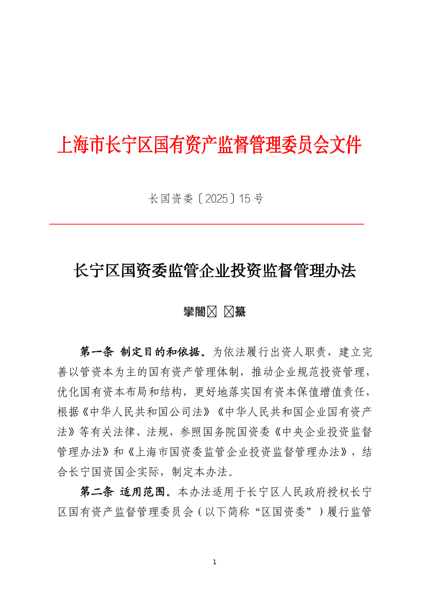 ??第一條 制定目的和依據(jù)。為依法履行出資人職責(zé),建立完善以管資本為主的國(guó)有資產(chǎn)管理體制,推動(dòng)企業(yè)規(guī)范投資管理,優(yōu)化國(guó)有資本布局和結(jié)構(gòu),更好地落實(shí)國(guó)有資本保值增值責(zé)任,根據(jù)《中華人民共和國(guó)公司法》《中華人民共和國(guó)企業(yè)國(guó)有資產(chǎn)法》等有關(guān)法律、法規(guī),參照國(guó)務(wù)院國(guó)資委《中央企業(yè)投資監(jiān)督管理辦法》和《上海市國(guó)資委監(jiān)管企業(yè)投資監(jiān)督管理辦法》,結(jié)合長(zhǎng)寧國(guó)資國(guó)企實(shí)際,制定本辦法。