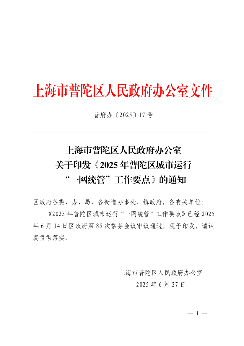 ??《2025年普陀區(qū)城市運(yùn)行“一網(wǎng)統(tǒng)管”工作要點》已經(jīng)2025年6月14日區(qū)政府第85次常務(wù)會議審議通過,現(xiàn)予印發(fā)。請認(rèn)真貫徹落實。