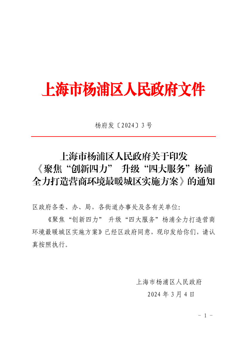 ??《聚焦“創(chuàng)新四力” 升級(jí)“四大服務(wù)”楊浦全力打造營(yíng)商環(huán)境最暖城區(qū)實(shí)施方案》已經(jīng)區(qū)政府同意,現(xiàn)印發(fā)給你們,請(qǐng)認(rèn)真按照?qǐng)?zhí)行。