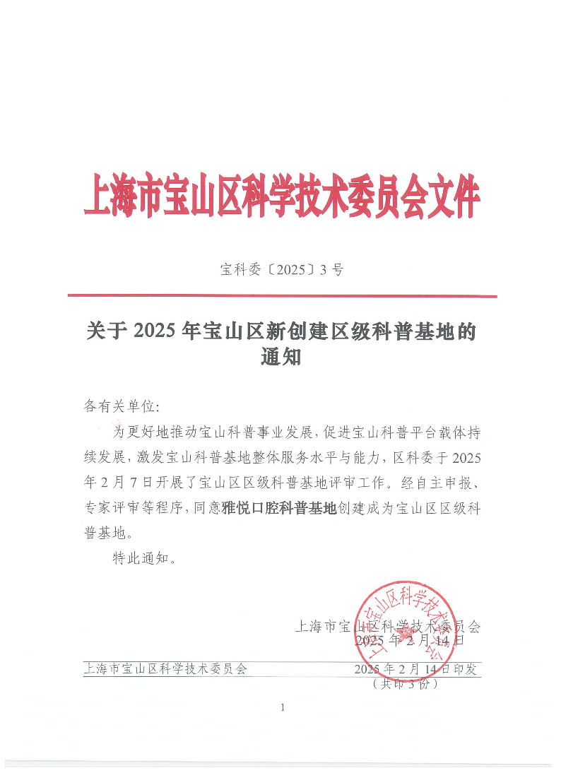 ??為更好地推動寶山科普事業(yè)發(fā)展,促進寶山科普平臺載體持續(xù)發(fā)展,激發(fā)寶山科普基地整體服務水平與能力,區(qū)科委于2025年2月7日開展了寶山區(qū)區(qū)級科普基地評審工作。經自主申報、專家評審等程序,同意雅悅口腔科普基地創(chuàng)建成為寶山區(qū)區(qū)級科普基地。