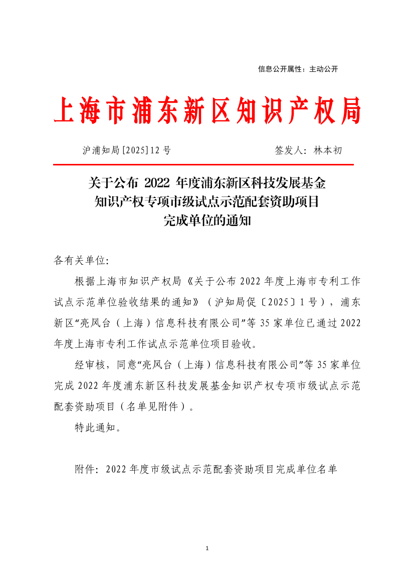 ??經(jīng)審核,同意“亮風(fēng)臺(上海)信息科技有限公司”等35家單位完成2022年度浦東新區(qū)科技發(fā)展基金知識產(chǎn)權(quán)專項市級試點示范配套資助項目(名單見附件)。