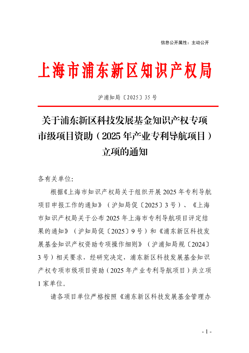 ??根據(jù)《上海市知識(shí)產(chǎn)權(quán)局關(guān)于組織開(kāi)展2025年專(zhuān)利導(dǎo)航項(xiàng)目申報(bào)工作的通知》(滬知局促〔2025〕3號(hào))、《上海市知識(shí)產(chǎn)權(quán)局關(guān)于公布2025年上海市專(zhuān)利導(dǎo)航項(xiàng)目評(píng)定結(jié)果的通知》(滬知局促〔2025〕9號(hào))和《浦東新區(qū)科技發(fā)展基金知識(shí)產(chǎn)權(quán)資助專(zhuān)項(xiàng)操作細(xì)則》(滬浦知局規(guī)〔2024〕3號(hào))相關(guān)要求,經(jīng)研究決定,浦東新區(qū)科技發(fā)展基金知識(shí)產(chǎn)權(quán)專(zhuān)項(xiàng)市級(jí)項(xiàng)目資助(2025年產(chǎn)業(yè)專(zhuān)利導(dǎo)航項(xiàng)目)共立項(xiàng)1家單位。