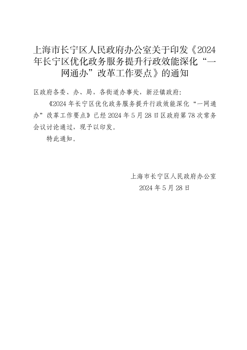 上海市長寧區(qū)人民政府辦公室關(guān)于印發(fā)《2024年長寧區(qū)優(yōu)化政務(wù)服務(wù)提升行政效能深化“一網(wǎng)通辦”改革工作要點》的通知